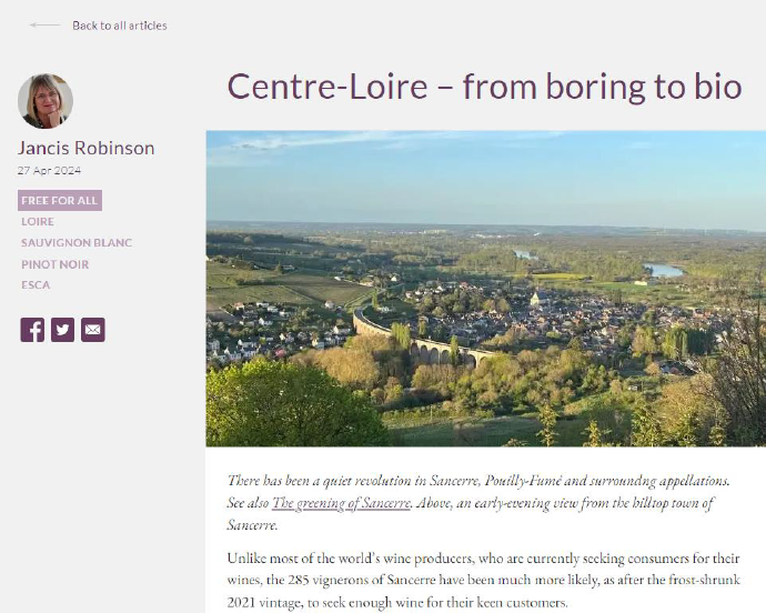 Suite à son rapide passage dans le Sancerrois pour qu’elle redécouvre notre superbe région et nos vins, elle a publié différents articles sur son site internet, mais également dans son célèbre magazine « The Financial Times ».