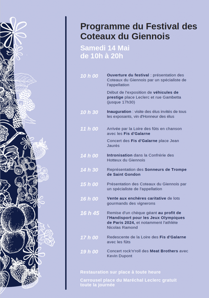 L’Office de Tourisme de Gien, le Club Rotary Gien-Sully, le Lions Club Sully Gien, le Syndicat Viticole des Coteaux du Giennois et le Ville de Gien sont ravis de vous présenter un tout nouvel événement à Gien au mois de mai prochain : le Festival des Coteaux du Giennois.