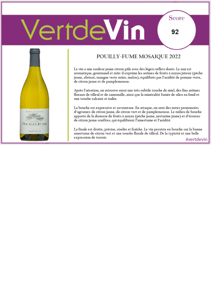 La finale est droite, précise, ciselée et fraîche. Le vin persiste en bouche sur la bonne amertume de citron vert et une touche florale de tilleul. De la typicité et une belle expression de terroir.