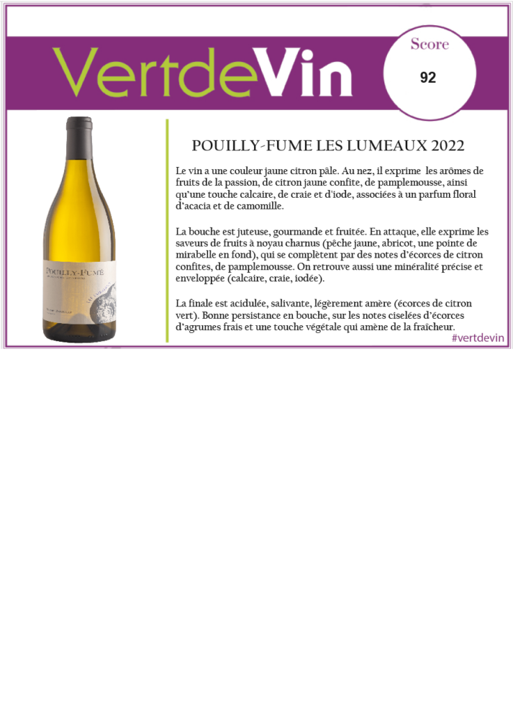 La finale est acidulée, salivante, légèrement amère (écorces de citron vert). Bonne persistance en bouche, sur les notes ciselées d’écorces d’agrumes frais et une touche végétale qui amène de la fraîcheur.